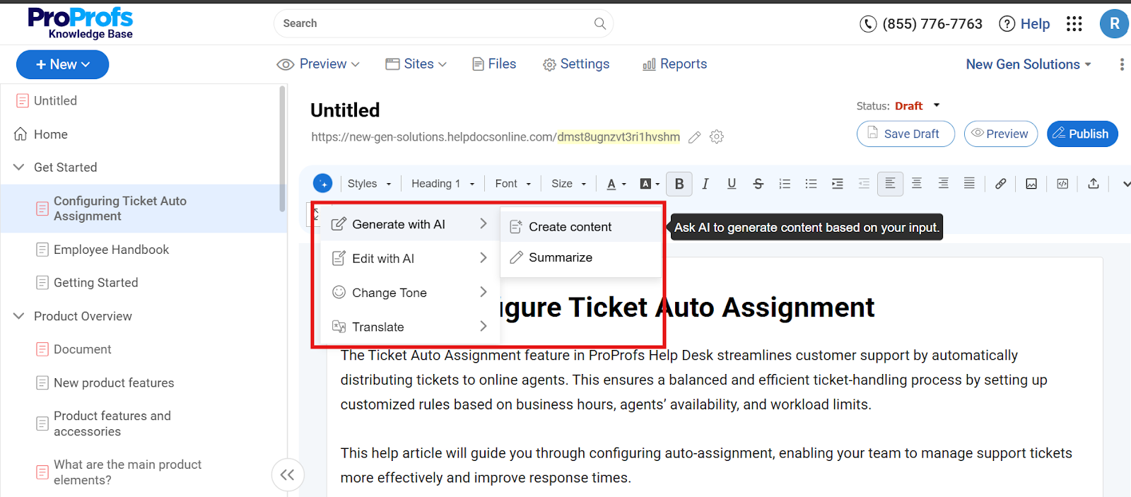 - AI Writer & Content Automation – Quickly generate and enhance help articles using built-in prompts and smart suggestions, saving time for support teams.